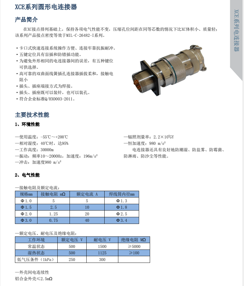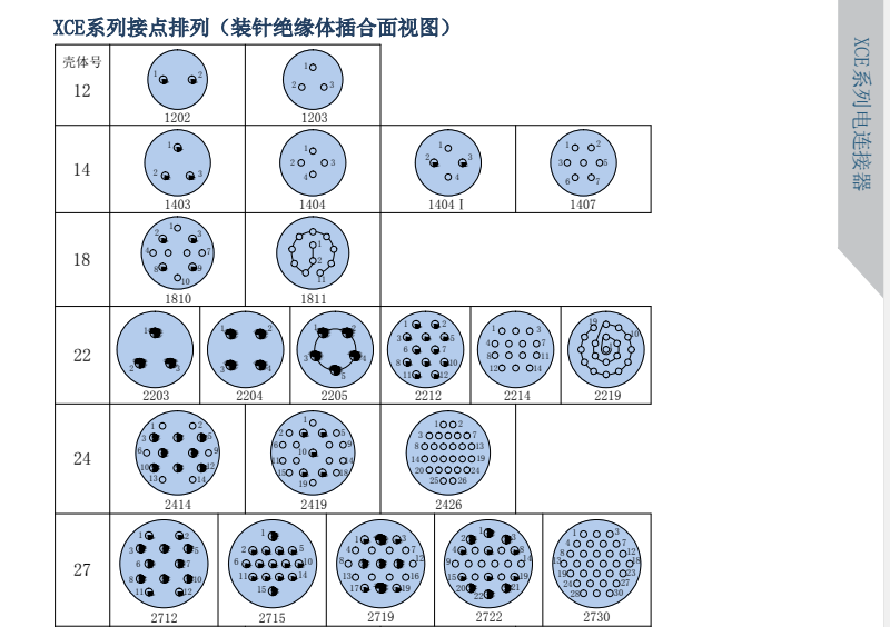 XCE航空電連接器在XC接點排列基礎上,保持各項電氣性能不變,壓縮孔位間距,同等情況下比XC型體積小,重量輕,接點密度等效于GJB2889標準,相當于MIL-C-16482系列,有五種鍵位防盲插和防錯插功能。插頭和插座端接形式焊接。