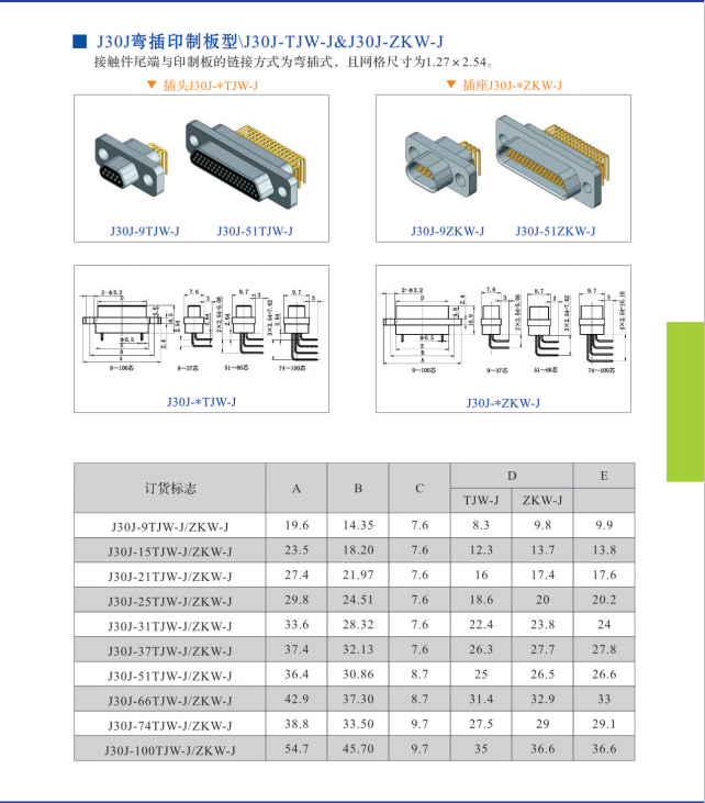 J30J-25TJ/ZKW彎式印制板矩形接插件,結(jié)構(gòu)與正常矩形連接器是一樣的,,不同的是端接方式有所改變,除電纜式焊接,直式印制板焊接外。這個焊接插針是90°彎角。一般是用在小型儀器設(shè)備,空間小,而且線路板是平躺式的,與設(shè)備墻體成90°,在此要注意的是線路板上開孔時建議和廠家多聯(lián)系,按照廠家開孔圖紙進(jìn)行打孔,以免誤差,以下是產(chǎn)品結(jié)構(gòu)圖,氣功看看: