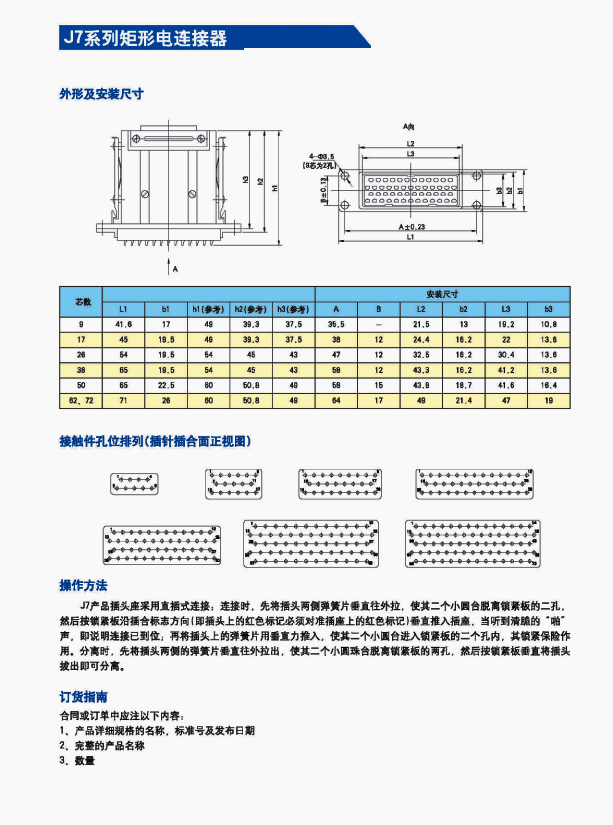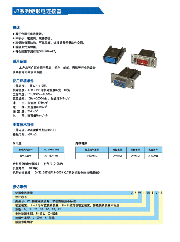 J7-50ZJ/TK矩形航空插頭座適用于各種電子儀器、電氣設(shè)備系統(tǒng)之間的電路連接。該產(chǎn)品為 電子元器件制造廠生產(chǎn)線認證合格產(chǎn)品;認證采用的國家 標準為GJB 176-86《耐環(huán)境線簧孔矩形電連接器總規(guī)范》。連接方式為直插連接,使用方便,可快速插拔。帶有獨特的雙重鎖緊機構(gòu),防雨,外殼屏幕,插座灌膠密封。體積小,重量輕。插孔采用高可靠性能插孔,插拔力小,使用壽命長。