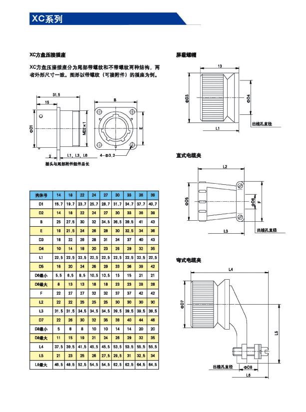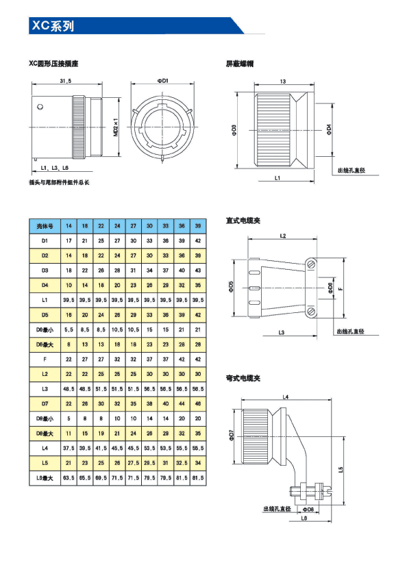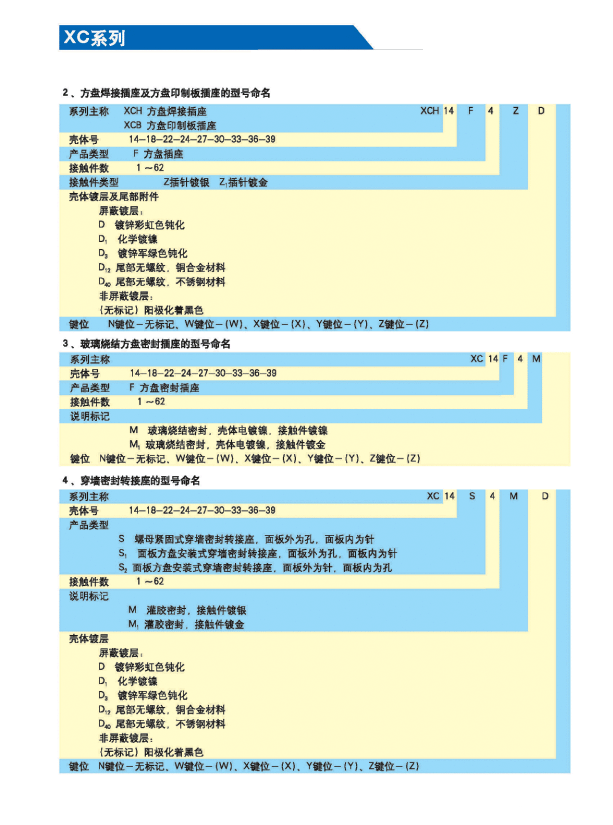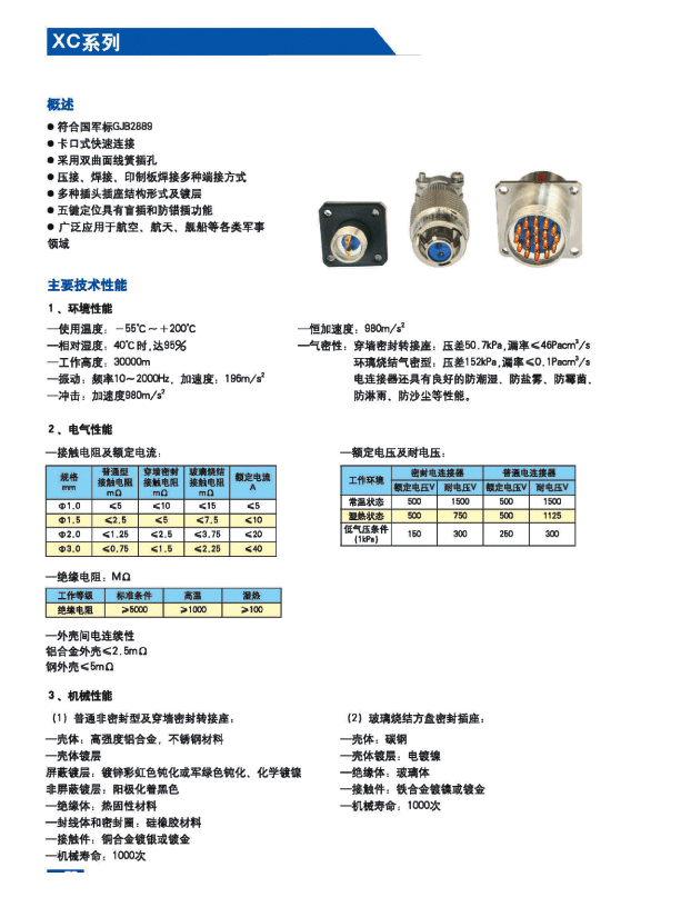 XC系列航空電連接器(航空插頭)為低頻類電連接器。九種殼體號;4種接觸件規(guī)格;32種孔位排列。從1孔到62孔。采用卡口式快速連接系統(tǒng),操作方便,連接可靠,耐振動,抗沖擊。五鍵槽定位,具有盲插和防誤插功能。高可靠的雙曲面線簧孔使連接器插拔柔和,接觸電阻小,工作可靠。插座共有五種結(jié)構(gòu)