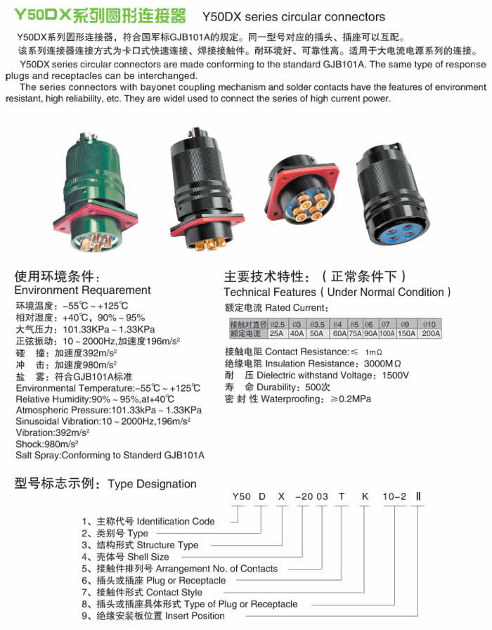 Y50DX-4芯100A圓形電纜連接器,電流大,接觸件4芯,額定電流100A,插頭與插座采用快速卡口連接,防震,防脫落,廣泛用于電源設(shè)備之間線路連接。