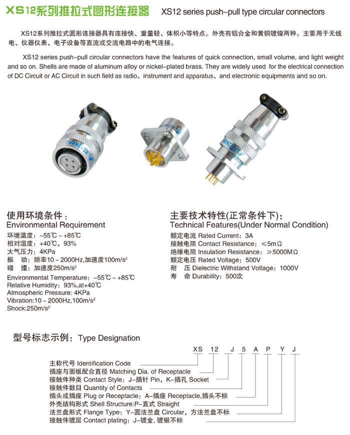 XS12推拉式圓形電連接器 的外殼配合直徑為12mm,接觸對有3.4.5.7芯,插頭分為電線夾固式和像膠互套式二種,插座分為方形和圓形二種,可直接安裝在面板上使用,連接器的外殼為黃銅,表面噴砂鍍鎳,外型小巧美觀,連接形式為推入式鋼球鎖緊,插拔迅速方便,本產(chǎn)品適用于各種儀器,電子設備等交直流電路的連接。有連接快,重量輕、體積小等特點。外殼有鋁合金和黃銅鍍鎳兩種。主要用于無線電、儀器儀表、電子設備等直流或交流電路中。