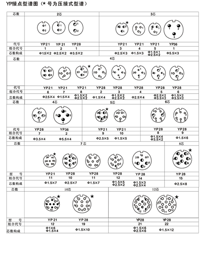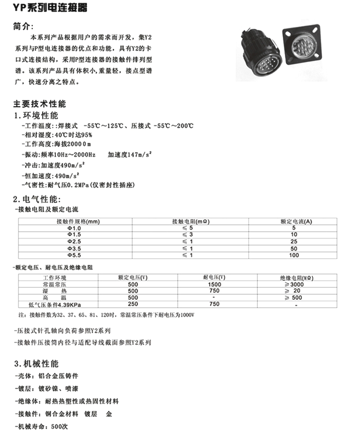 YP系列 圓形電連接器(航空插頭)簡(jiǎn)介:根據(jù)用戶的需求而開發(fā),集Y2系列與P型電連接器的優(yōu)點(diǎn)和功能,具有Y2的卡口式連接結(jié)構(gòu),采用P型連接器的接觸件排列型譜。該系列產(chǎn)品具有體積小,重量輕,接點(diǎn)型譜廣,快速分離之特點(diǎn)。