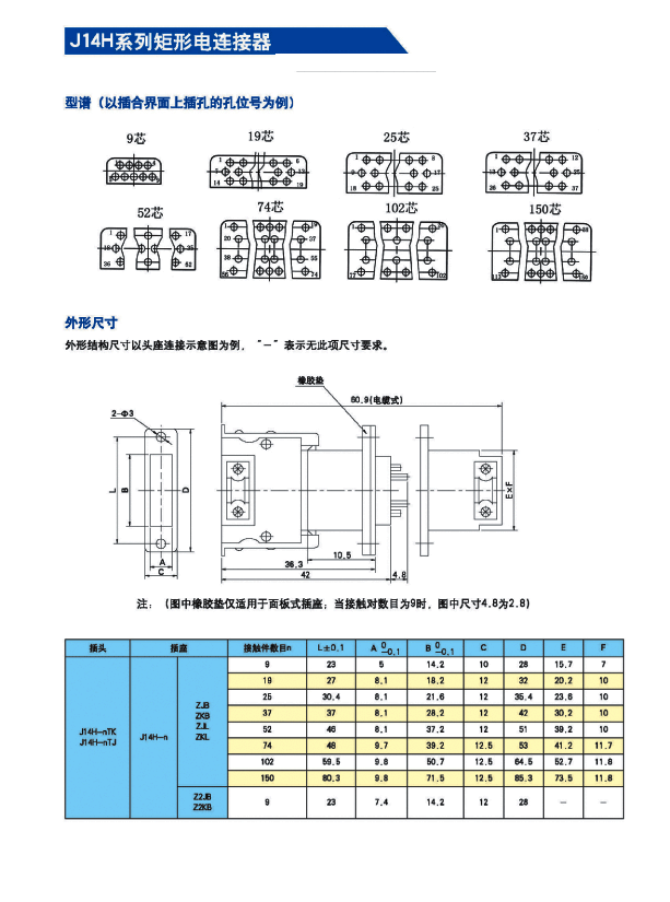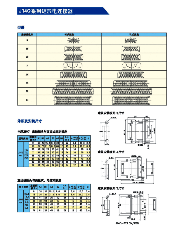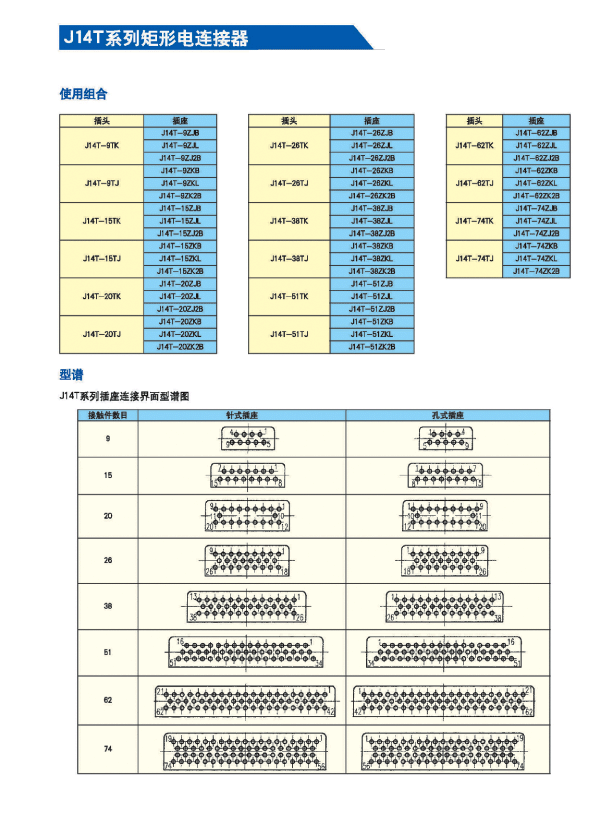 74芯矩形電連接器有好多系列,我公司有:J30J,J14A,J36A系列。請參照以下表格,根據(jù)自己的要求選用。